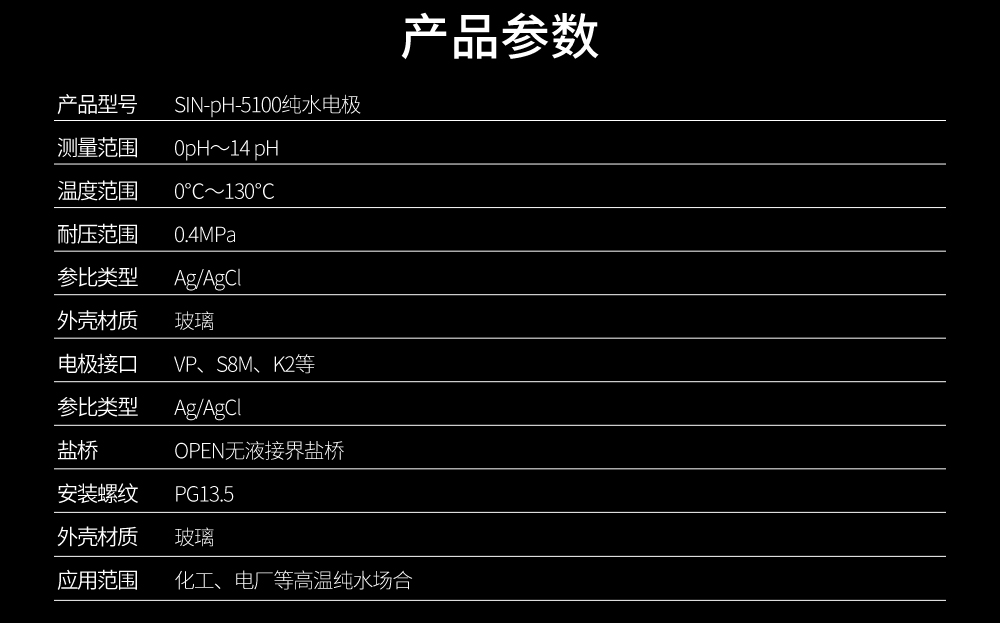 pH-5100 電極使用耐壓半球形 pH 敏感膜,混合膠 GMT 構成的中介電介質,Ag/AgCL/KCL 外參比體系,無鹽橋 (OPEN)開口液接界所構成。CN4