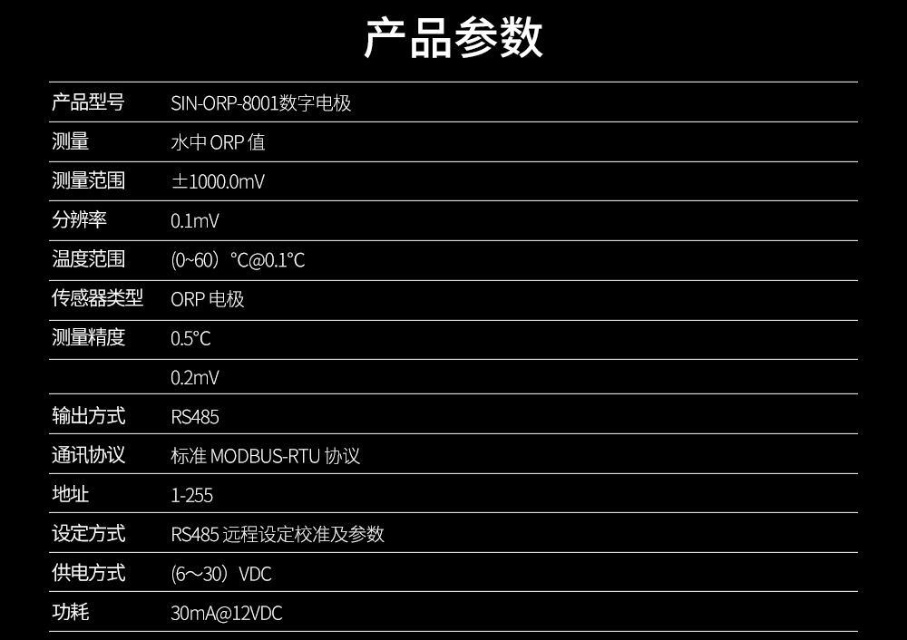 ORP 數字式電極,帶數字接口(RS485*1),可用于測量量程范圍內水溶液體系中 ORP 值的變化情況。其帶有標準 RS485 Modbus RTU 協議接口功能,可以與上位機進行遠程通訊。本產品可應用于水產養殖、水質檢測、信息化數據采集、物聯網水質檢。CN1