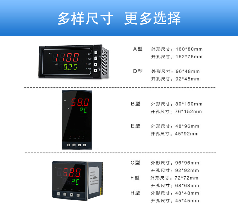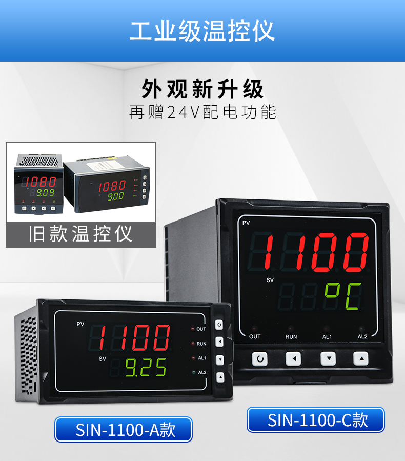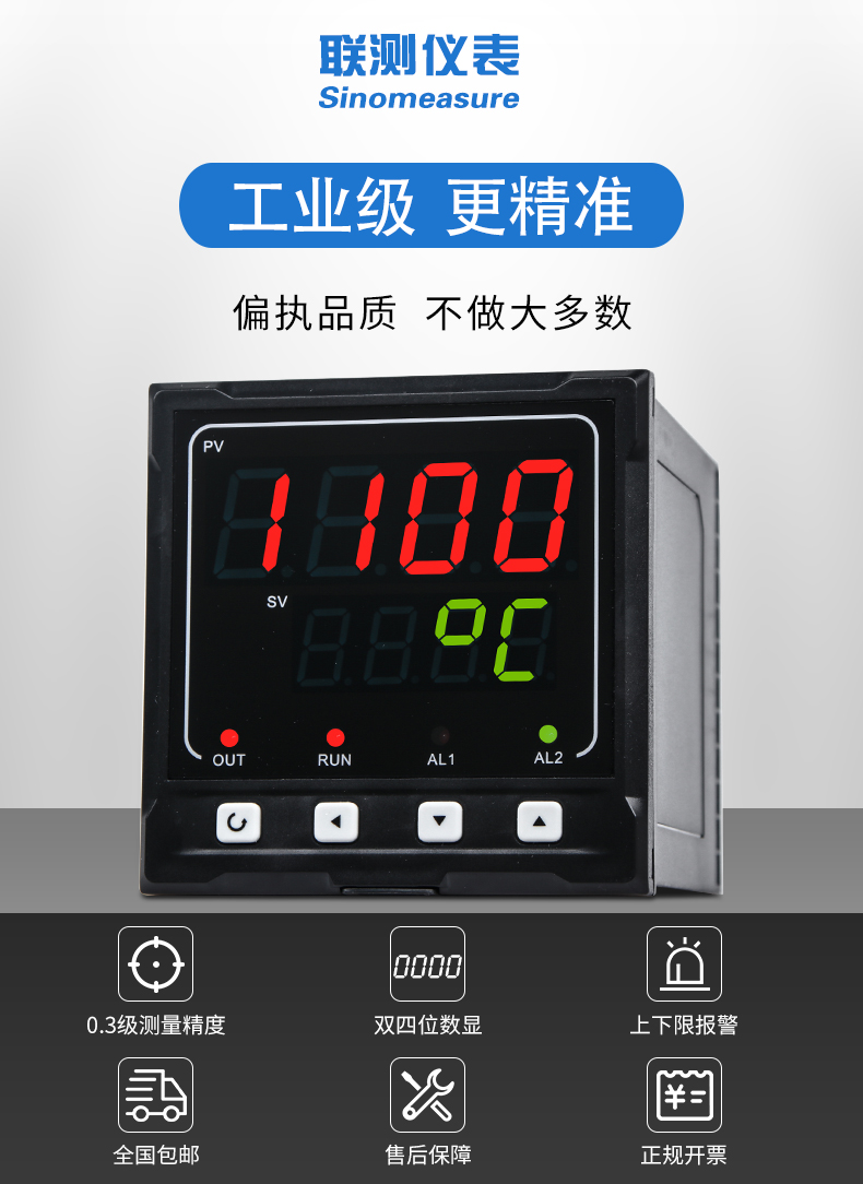 聯測SIN-1100數顯表(簡易型),傻瓜式操作,0.3級測量精度,7款外型尺寸,雙四位LED顯示,可支持熱電偶、熱電阻、電壓(可開方運算)、電流(可開方運算)及變送器輸入,適用溫度、壓力、流量、液位、濕度等工業過程量的監測。CN2