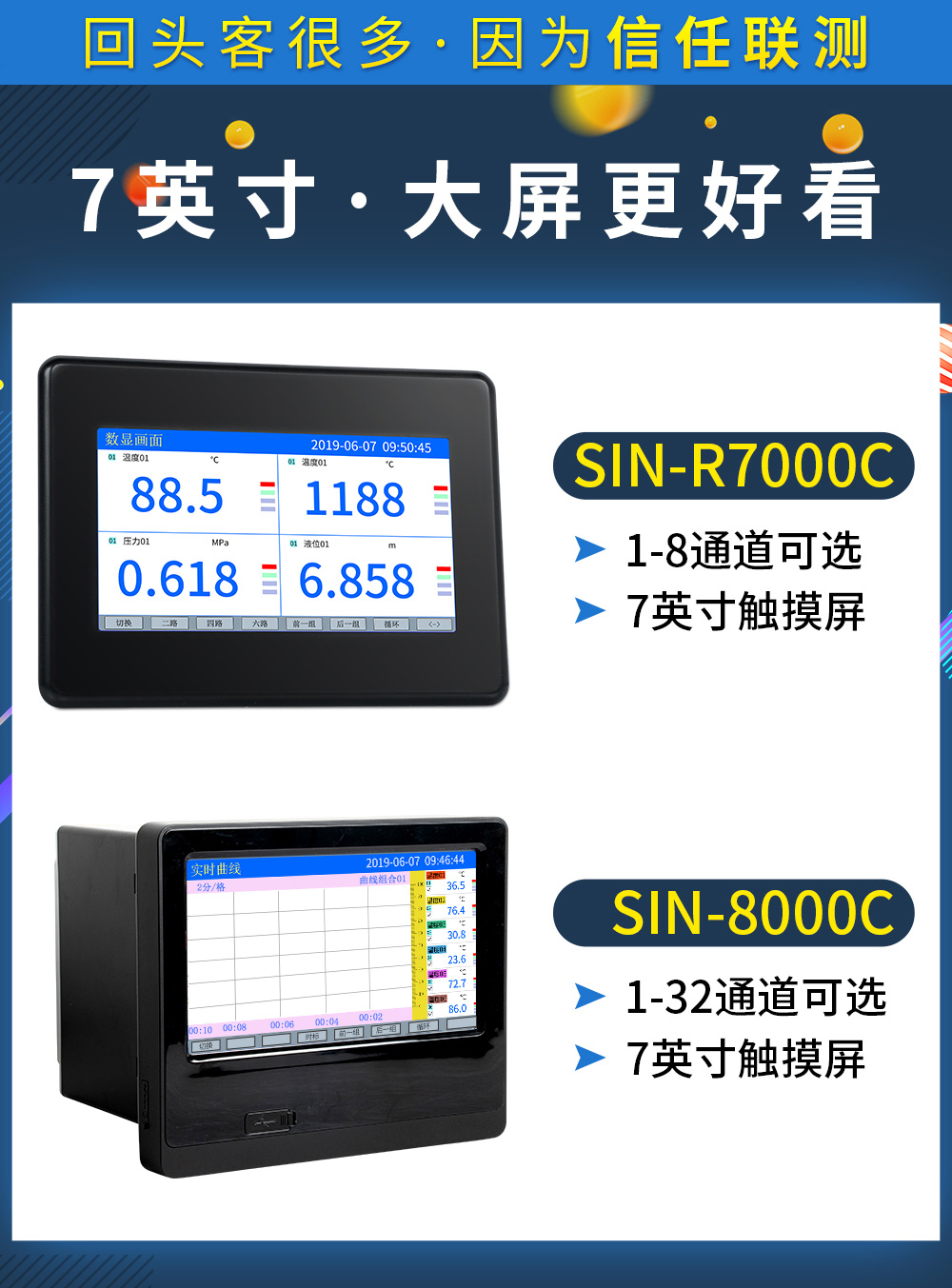 聯(lián)測_SIN-R8000C_(觸摸屏)1-32路可選_7英寸無紙記錄儀_溫度_壓力_多種參數(shù)