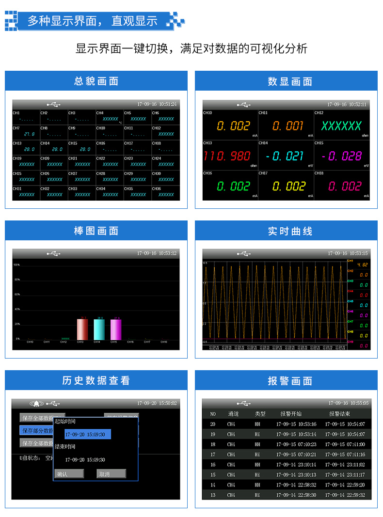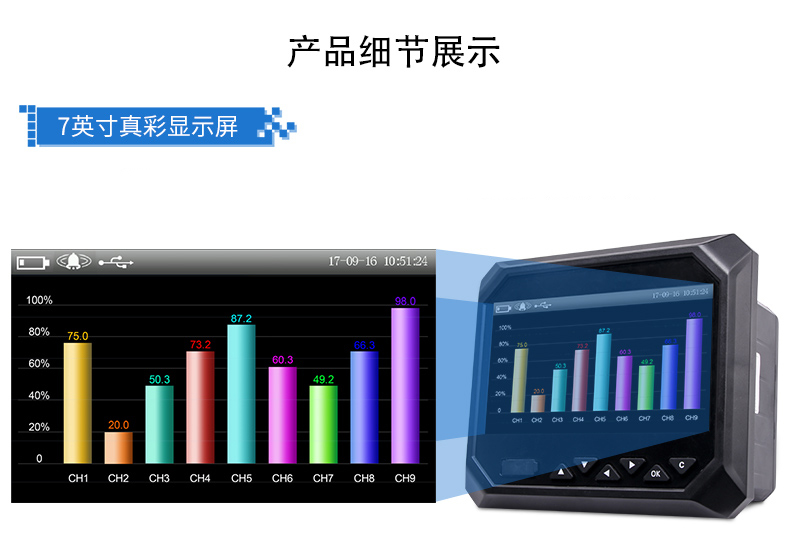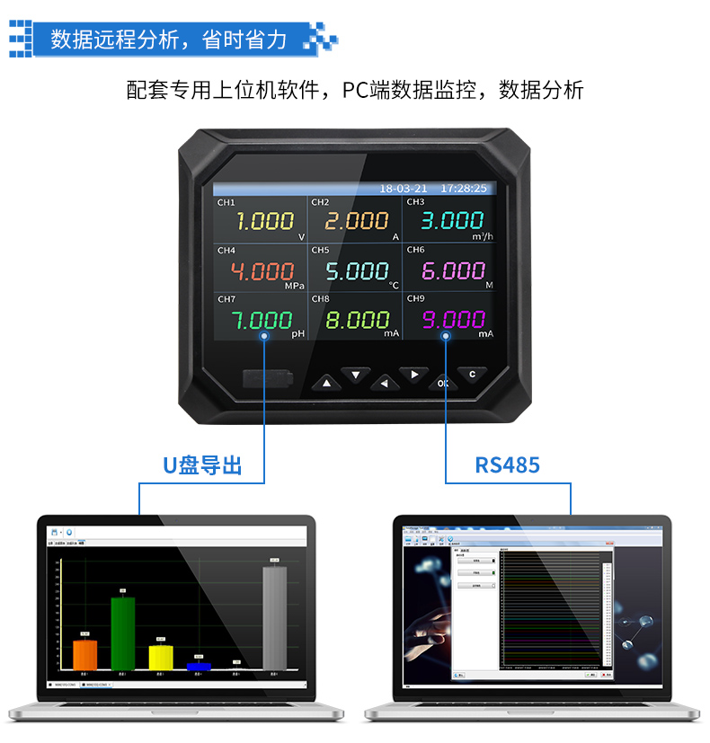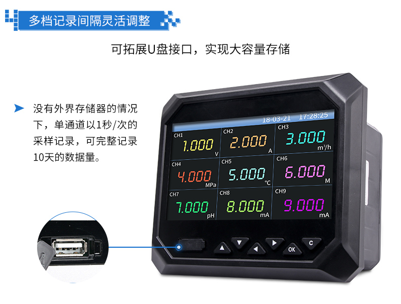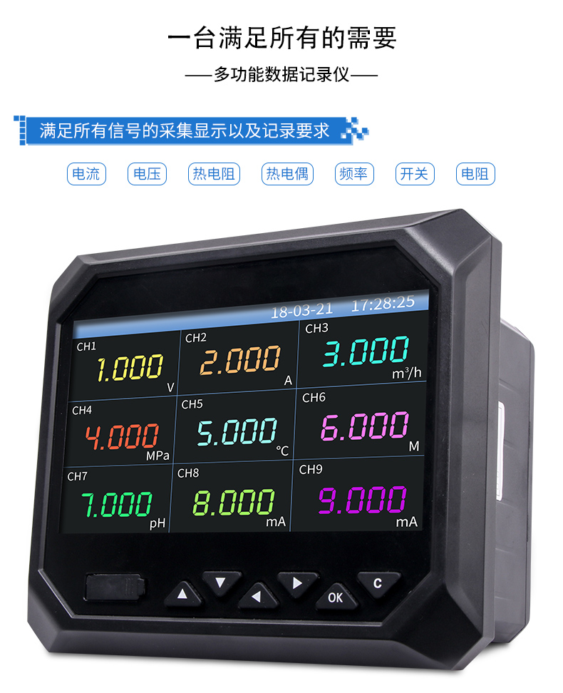 無(wú)紙記錄儀是將工業(yè)現(xiàn)場(chǎng)的各種需要監(jiān)視記錄的輸入信號(hào),比如熱電阻和熱電偶的溫度信號(hào)、流量計(jì)的流量信號(hào)、 壓力變送器的壓力信號(hào)等。通過(guò)高性能微處理器進(jìn)行數(shù)據(jù)處理,一方面在高分辨液晶顯示屏幕上以多種形式的畫面顯 示出來(lái),另一方面把這些監(jiān)察信號(hào)的數(shù)據(jù)存放在儀表內(nèi)部的大容量存儲(chǔ)芯片內(nèi),以便在儀表上直接進(jìn)行數(shù)據(jù)和圖形查 詢、翻閱和打印。CN5